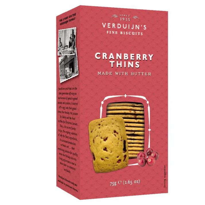 Biscuiții cu merișoare de la Verduijn's Fine Biscuits sunt o specialitate artizanală olandeză, produsă după o rețetă tradițională de familie, transmisă din 1935. Crocanți și subțiri, acești biscuiți sunt îmbogățiți cu bucățele de merișoare uscate, care aduc o notă fructată, dulce-acrișoară, perfect echilibrată.
