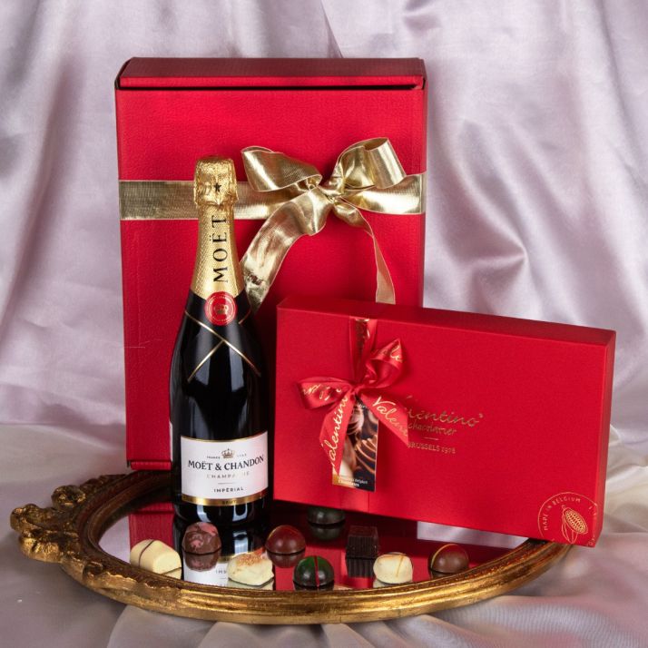 În centrul pachetului se află Moët & Chandon Impérial Brut, un champagne emblematic, cu bule fine, echilibru perfect și acel aer festiv care schimbă instant atmosfera. Alături, Valentino Luxedoos Rectangular aduce partea de răsfăț în forma ei cea mai elegantă: praline belgiene fine, într-o cutie luxoasă, gândită să impresioneze din prima secundă.
