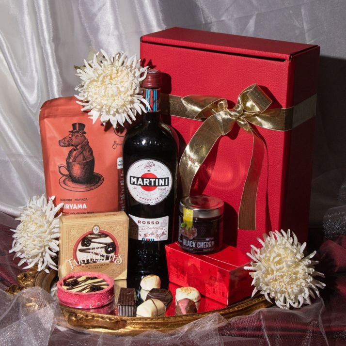 Partea dulce completează perfect: tarta Laurence Chocolate cu biscuiți oferă o textură crocantă și un gust fin, în timp ce mierea Casa Folino cu cireșe amare adaugă un contrast sofisticat — dulce, fructat, ușor amărui, exact cât trebuie pentru un răsfăț cu personalitate. Iar pentru final, pralinele belgiene Valentino Ballotin vin ca o declarație de eleganță: ciocolată fină, lucrată cu atenție, într-o selecție care impresionează.