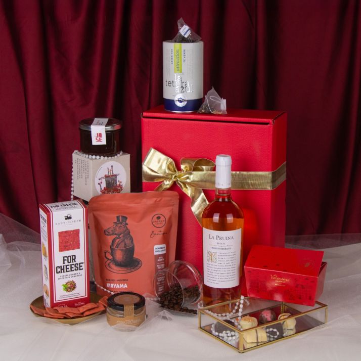Pe partea gourmet, am adăugat accente care transformă cadoul într-o mică degustare: aperitivul Lady Joseph cu piper mozaic pentru brânză este crocant și aromatic, ideal alături de un platou, iar crema de brânză La Chinata aduce o textură fină, perfectă pentru pairing-uri rapide și elegante. Pentru o notă dulce-fructată, gemul José de fructe roșii adaugă prospețime și culoare, iar pralinele belgiene Valentino Ballotin închid selecția cu un final premium, fin și memorabil.