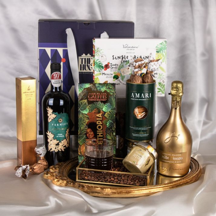 În centrul pachetului sunt două delicii Casa Folino: crema de alune de pădure, densă și mătăsoasă, și mierea cu alune, un amestec delicat, cu aromă rotundă și naturală. Pentru momentele de „ceva bun lângă cafea”, am ales cantuccini Dolci Amari cu smochine și migdale — crocante, parfumate, exact cât trebuie de rafinate. Iar pentru un final memorabil, pralinele belgiene Valentino Single Origin adaugă acea notă premium: ciocolată fină, lucrată cu atenție, cu gust complex și elegant.