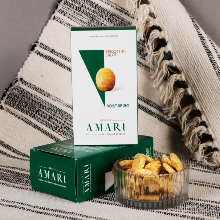Crackers AMARI cu rozmarin sunt pregătiți conform tradiției italiene, din ingrediente de calitate superioară care evidențiază prospețimea și intensitatea ierburilor aromatice. Fiecare biscuit este realizat cu grijă, iar rozmarinul aduce o notă distinctă, elegantă și ușor rustică.