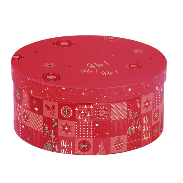 Cutia rotundă Christmas Mosaic impresionează printr-un mozaic de culori strălucitoare – roșu intens, roz delicat și accente aurii – care amintesc de vitraliile sărbătorilor de iarnă. Finisajul reliefat cu ștanțare la cald conferă adâncime și textură, transformând cartonul robust într-o piesă de artă tactilă. Această cutie nu este doar un ambalaj, ci un obiect de decor care adaugă magie oricărui cadou premium. Forma sa solidă și pereții din carton gros o fac potrivită pentru a susține cu eleganță sticle fine sau delicatese.