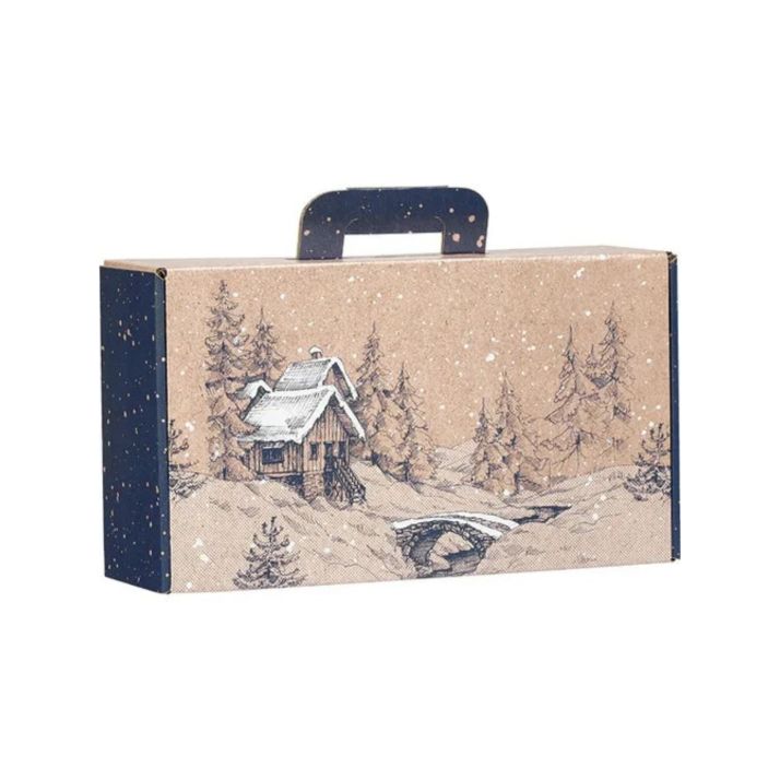 Cutia de tip valiză Canadian Blue nu este doar un ambalaj, ci o invitație la magie și emoție. Inspirată de liniștea iernilor canadiene, combină alb ul pur al zăpezii cu albastrul senin al cerului, imprimat pe un carton kraft natural și sofisticat. Această paletă cromatică delicată evocă atât eleganța, cât și căldura, oferind o notă poetică de sezon.