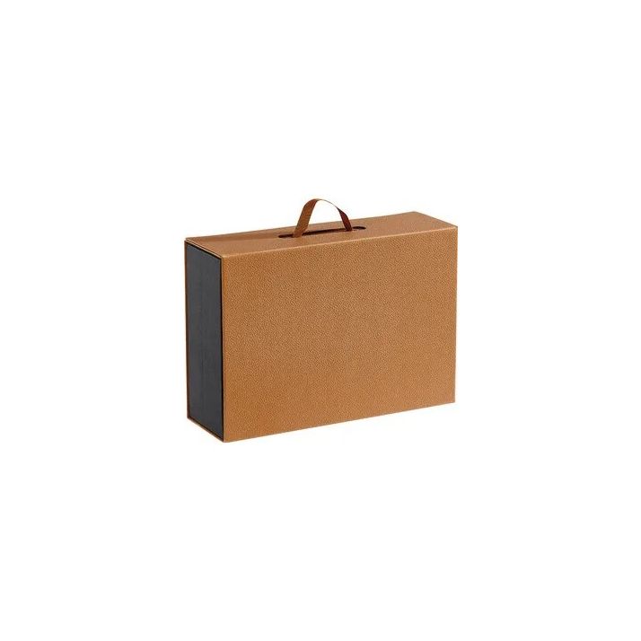 Descoperă eleganța atemporală a cutiei dreptunghiulare din carton cu textură Havana, un ambalaj rafinat ce îmbină funcționalitatea cu un design sofisticat. Culoarea caldă, naturală, completată de panglica neagră pentru manere și de sistemul de închidere magnetică, conferă un aspect premium și modern, ideal pentru ambalarea produselor de lux sau a cadourilor corporate.