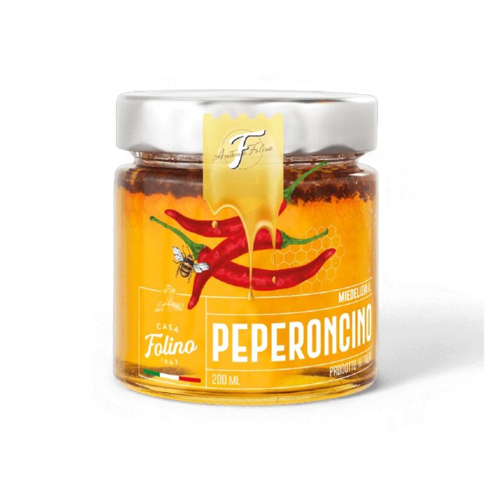 Miere cu chilli, 250g, Casa Folino- O combinație îndrăzneață între dulceața mierii și intensitatea chilli-ului