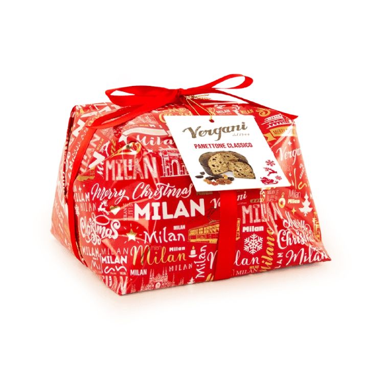 Panettone-ul tradițional de la Vergani este un desert italian emblematic, realizat după rețeta clasică și împachetat manual într-un ambalaj festiv, ideal pentru a fi oferit cadou în perioada sărbătorilor.