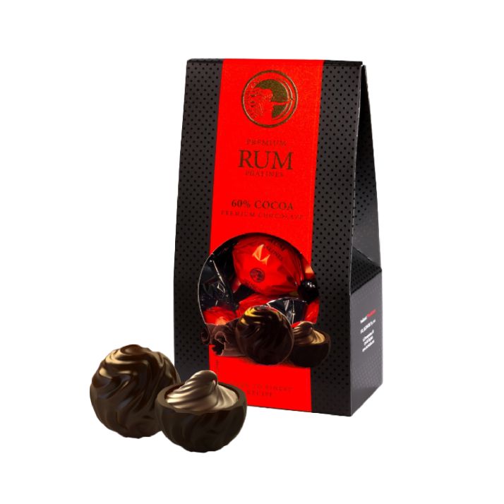 Aceste praline delicate sunt realizate cu ciocolată neagră 60 % cacao, ce îmbracă o cremă cu aromă de rom fin. Textura este catifelată, cu miez lichid ce eliberează treptat note calde de rom și tonuri blânde de zahăr brun.