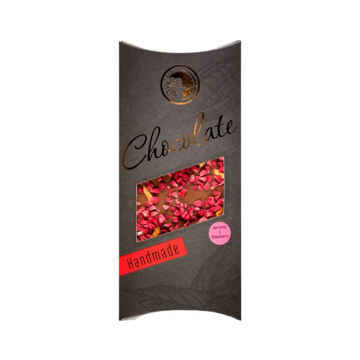 O tabletă rafinată ce combină textura cremoasă a ciocolatei, cu migdale crocante și zmeură ușor acrișoară. Ciocolata are un gust dulce și catifelat, cu note de caramel, care se îmbină armonios cu aroma fructelor roșii, și savoarea intensă a migdalelor prăjite.