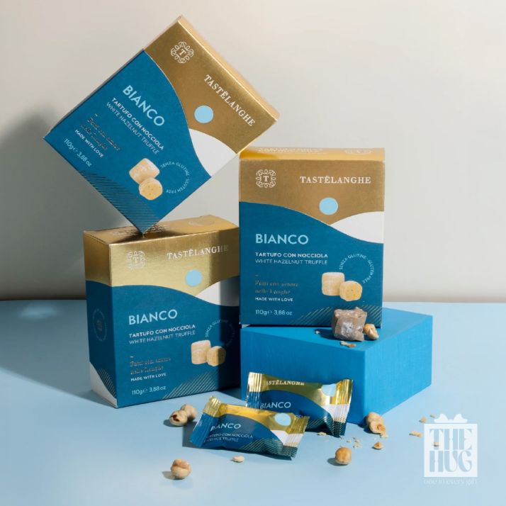 Trufe delicate, realizate cu ciocolată albă și pastă fină de alune Piemonte IGP. Gustul este fin și dulce, iar textura este moale, aproape fondantă.